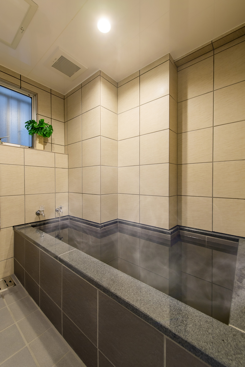 別府!と言ったら 温泉♨️ ただ、別府市の分譲マンションでも「共同浴場」はあっても、個々の室内に温泉が引かれているマンションはごくわずか!源泉温度は64度、無色無臭に近い透き通った温泉です。もちろん温泉の効能、保温、お肌の保湿力は言うまでもありませんね。左官職人が手掛けた温泉専用の石タイル風呂で、1日の疲れを湯った〜り癒してください◎